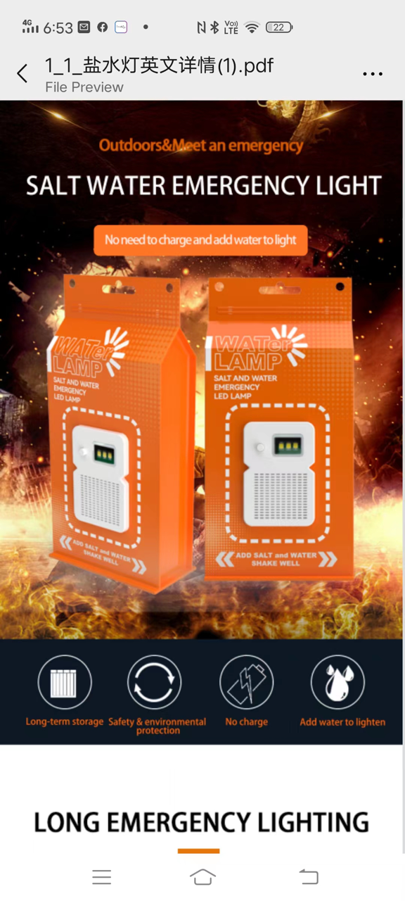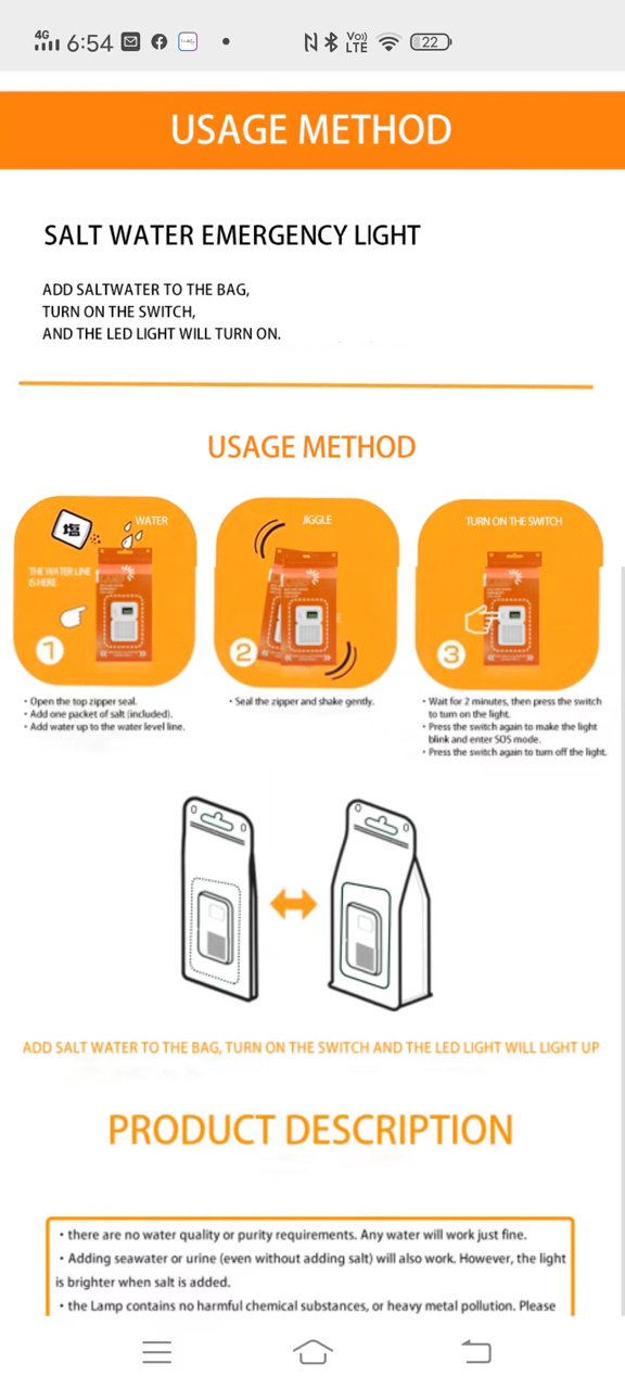 - 【Easy To Use】 Add saltwater up to the marked line, shake it, and then turn on the switch to light up the LED. It also comes with a strap. Secure the plastic hook loops onto the two holes on the top of the emergency light, so that you can hang it up.The substances generated during use are non-toxic, harmless, and environmentally friendly.Storage life of 5 years, mostly as an item for emergency storage, or on a boat, or one really cool science fair demonstration!