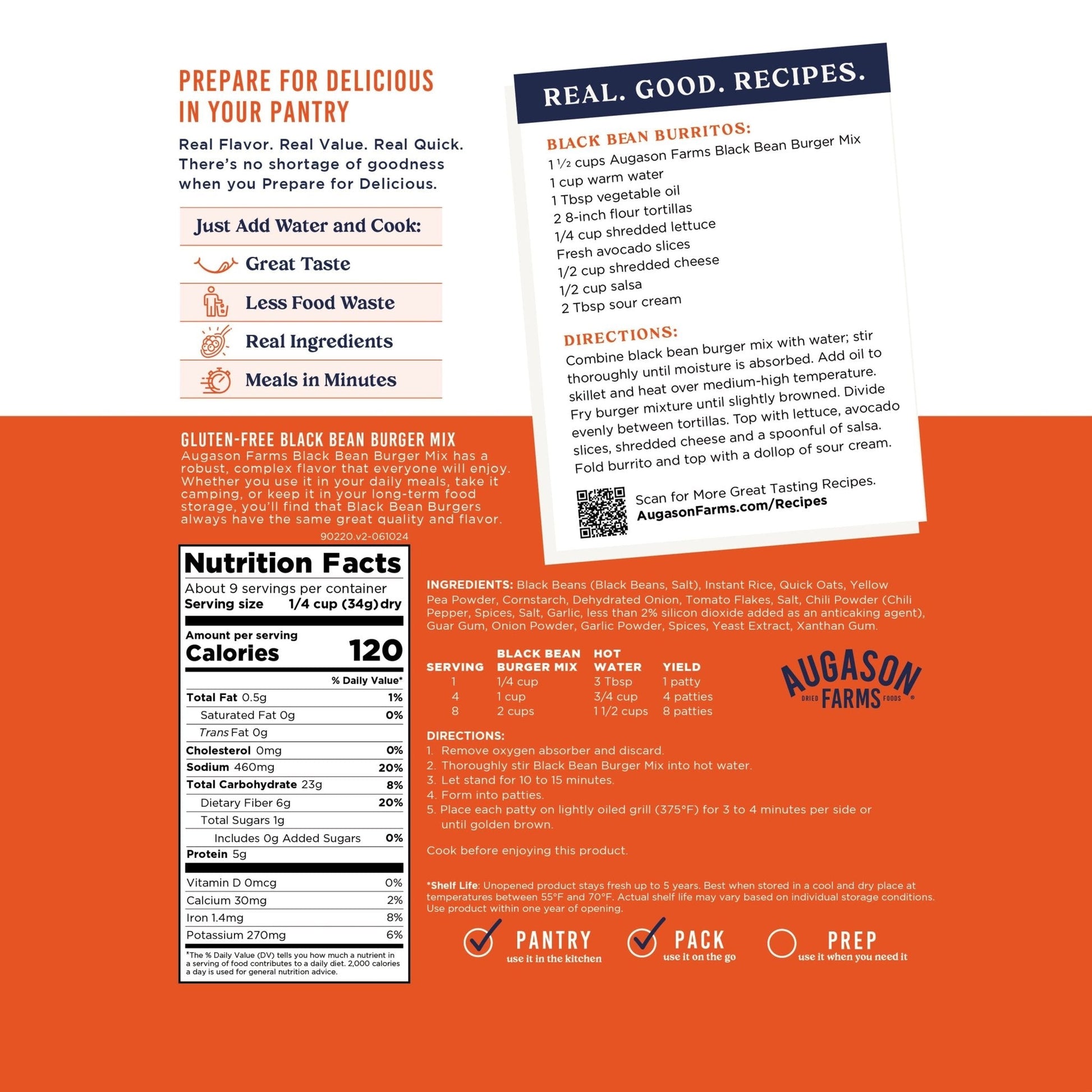 Gluten-Free Black Bean Burger is ideal for anyone who wants to bump up the protein in their emergency food supply. It provides meat-free meals for your long-term food supply and day-to-day meal preparation.