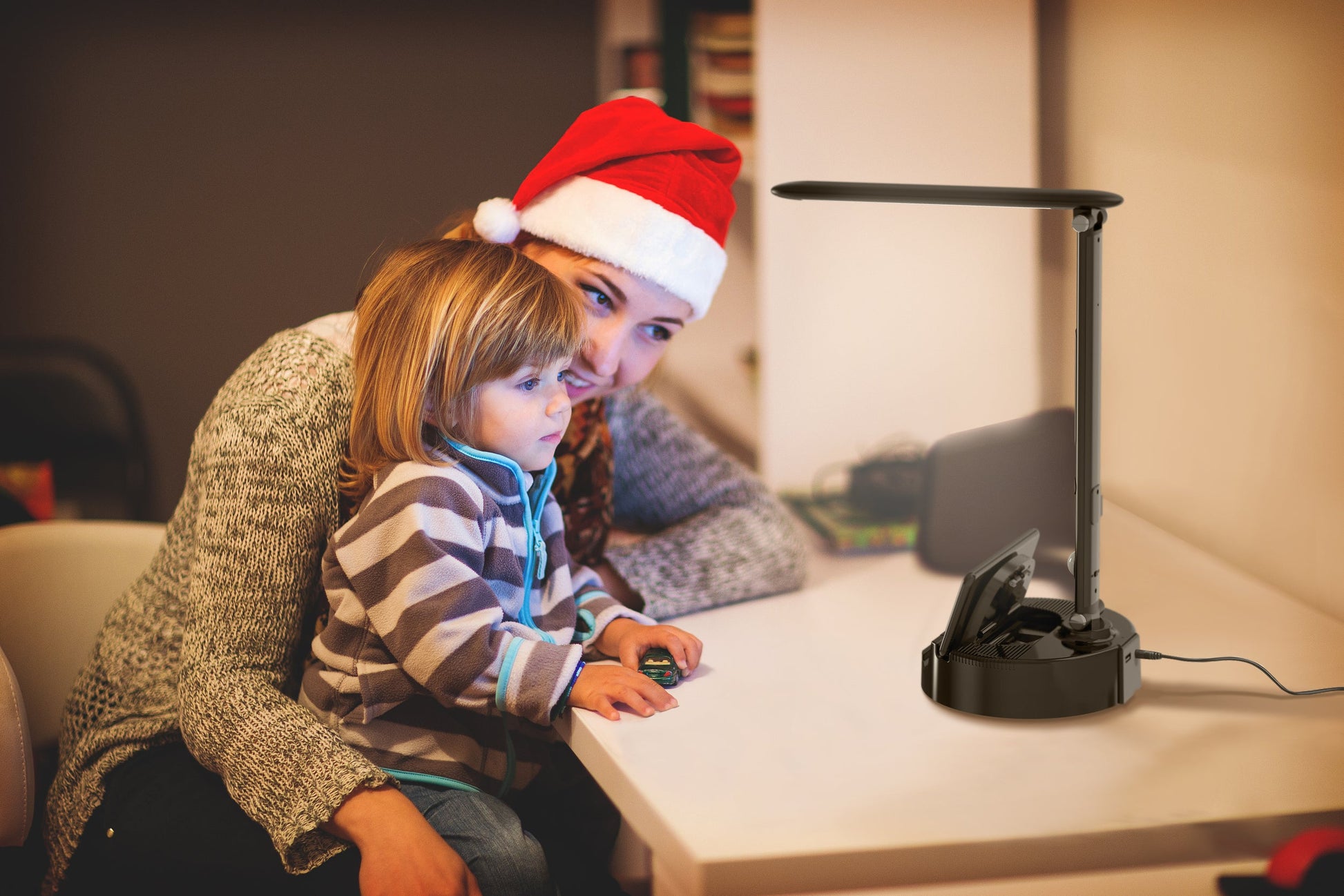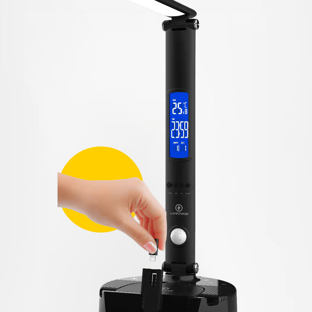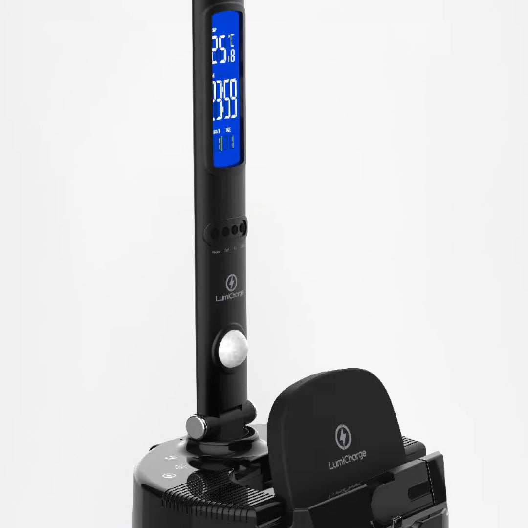 A sleek, multifunctional desk companion that seamlessly blends form and function. It features an adjustable LED lamp with customizable color modes and brightness, a 10W wireless charging pad (plus USB port) for quick device power-ups, and a built-in Bluetooth speaker. Control lighting, calendar, time and temperature display—all from your smartphone via the app. It even remembers your last settings and includes handy extras like a cup/pen holder, watch/headset clips, and a motion-sensor night light.