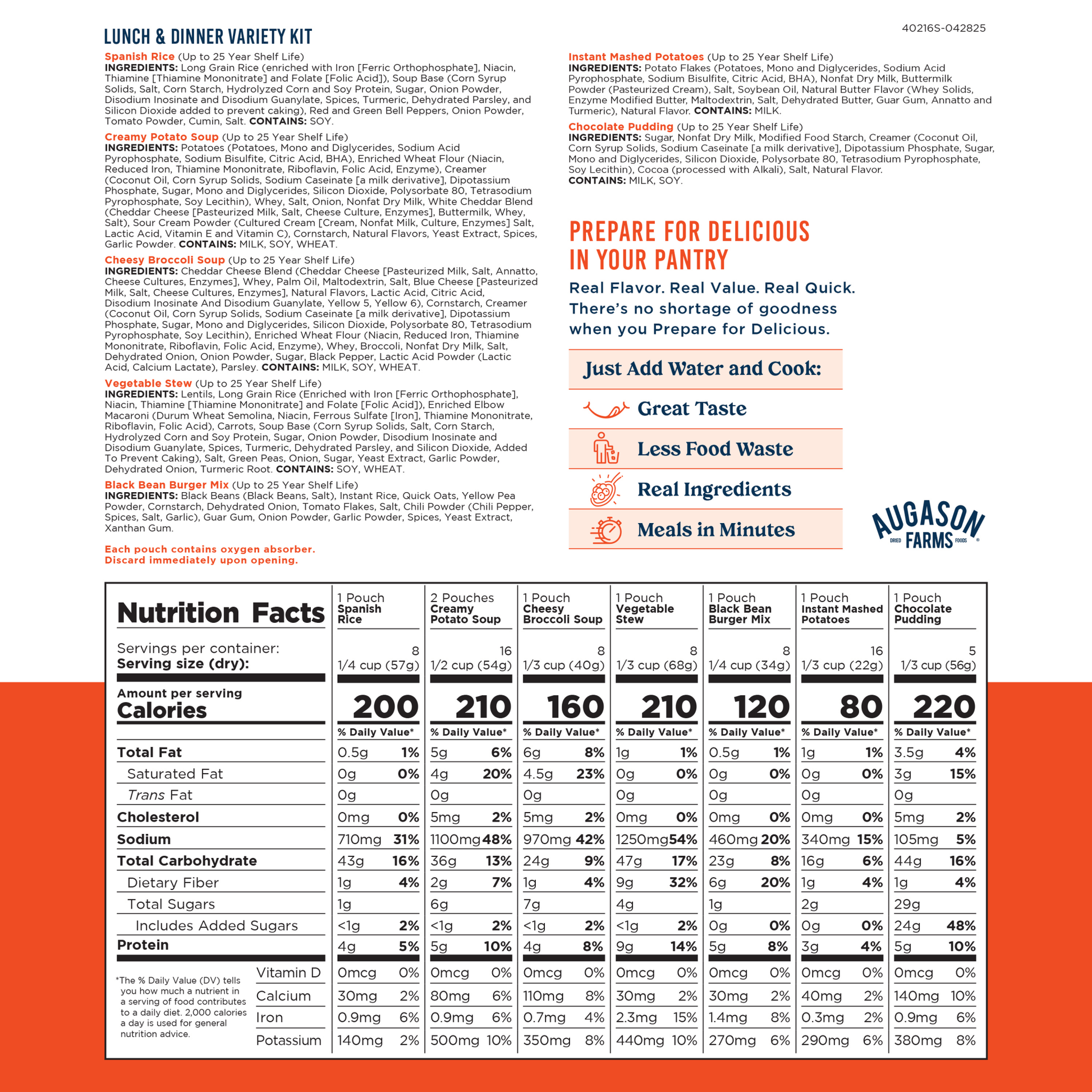 Getting the right calories and nutrients during an emergency can make all the difference. The Augason Farms Emergency Lunch and Dinner Variety Pail provides 12 hearty, great-tasting meal options to help sustain you through any situation. This dependable emergency food supply offers the variety, flavor, and nutrition your family needs when it matters most.